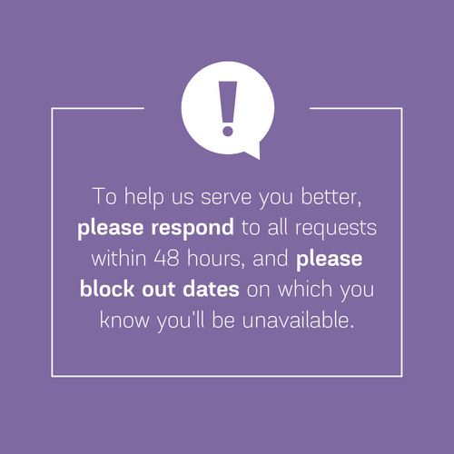 If you're unable to make rehearsal (we understand that unexpected issues can come up), please give us as much of a heads-up as possible.
